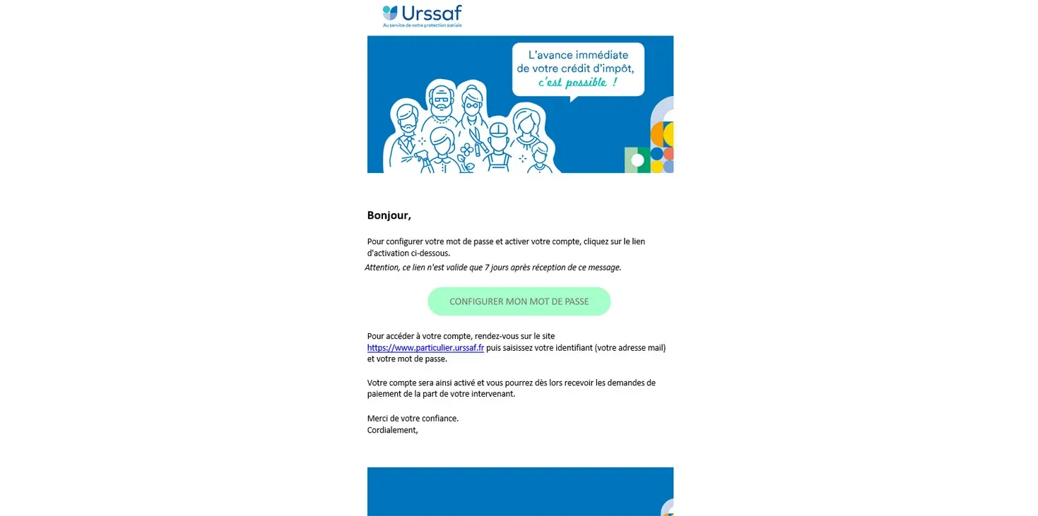 L’URSSAF vous envoie un email pour activer votre compte et valider le rattachement d’Acadomia à votre compte Urssaf.